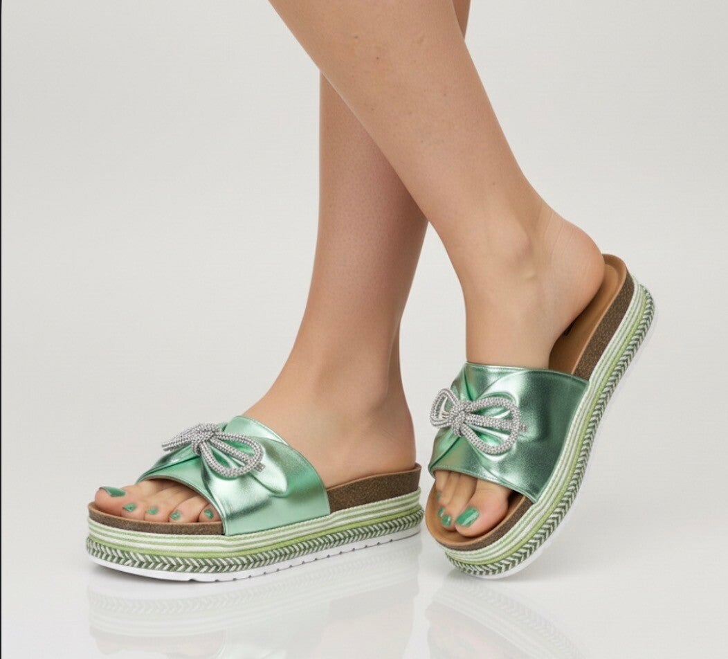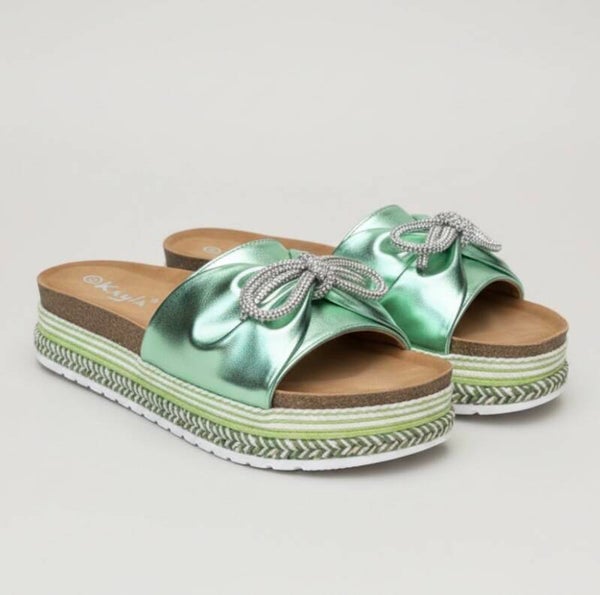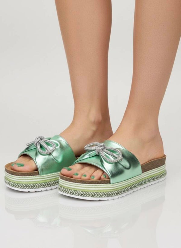 Deze prachtige Kayla damesslippers zijn voorzien van een metallic groene band en een opvallende strik.