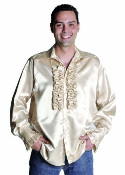 Het geplooide satijnen ruches blouse is zeer goede kwaliteit. Hoogwaardige glanzende satijnen stof die zeer comfortabel is om te dragen. Het satijnen overhemd is aan de voorkant dichtgeknoopt en heeft twee rijen opgestikte ruches. Er zijn ook ruches genaaid op de manchetten van de mouwen. De mooie brede kraag uit de jaren 70 maakt de look compleet.