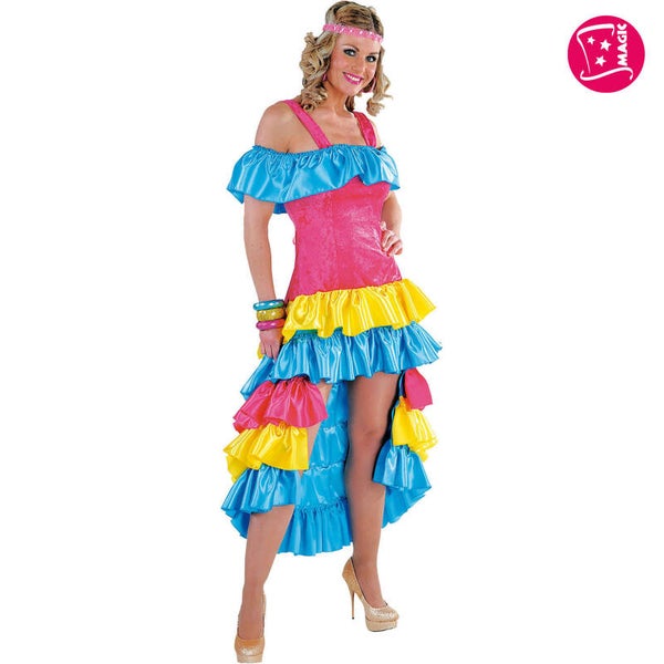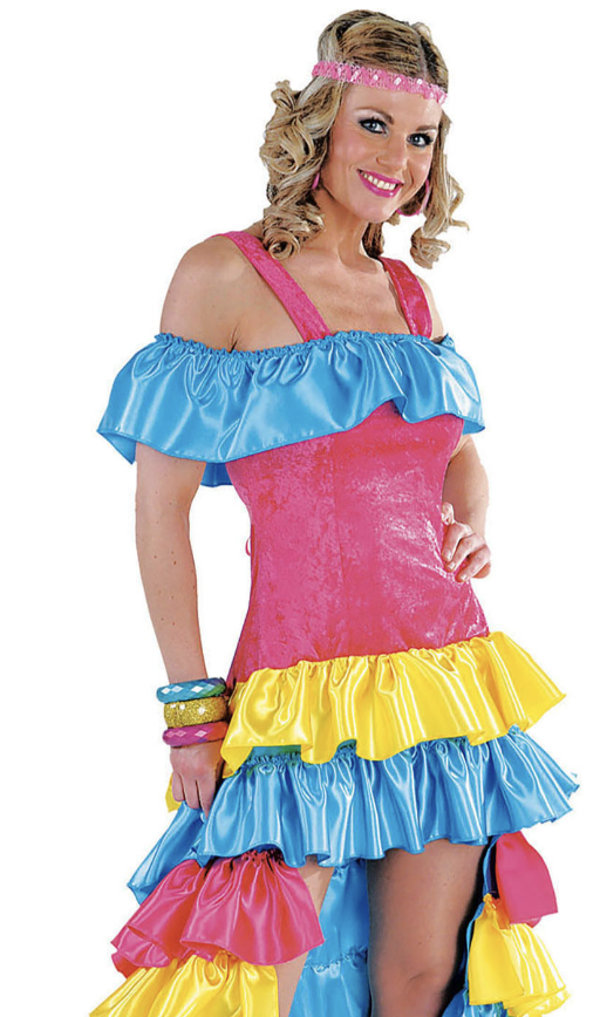 Kleur: roze, blauw en geelDetails: off-shoulder maar toch 2 schouderbandjes. De rok bestaat uit lagen rouches en is open aan de voorkant