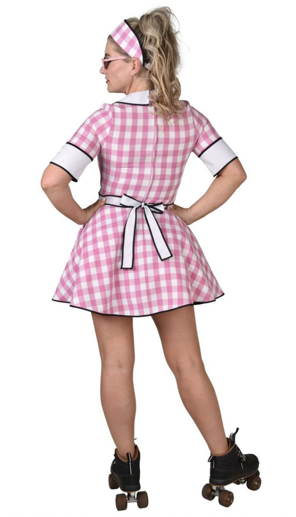 Dit klassieke retro kostuum is uitgevoerd in een roze-wit ruitpatroon en heeft een flatterende rok die perfect zwiert bij elke beweging. Perfect voor een rockabilly party, Grease-themafeest of carnaval! Combineer dit jurkje met een bijpassende bril en petticoat voor een complete ‘roller waitress’ outfit. Ready to serve in style!