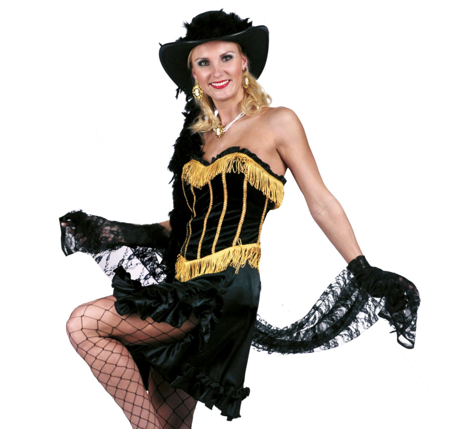 Een chique cowgirl! De cowgirl bestaat uit een korset met losse rok en kanten sjaal. De rok is van een dunne, gladde stof. Het korset is een zachte dikkere stof en wordt aan de achterkant gesloten met een rits.