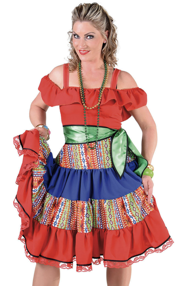 Vrolijk gekleurde jurk en sjerp in Mexicaans of Western thema.