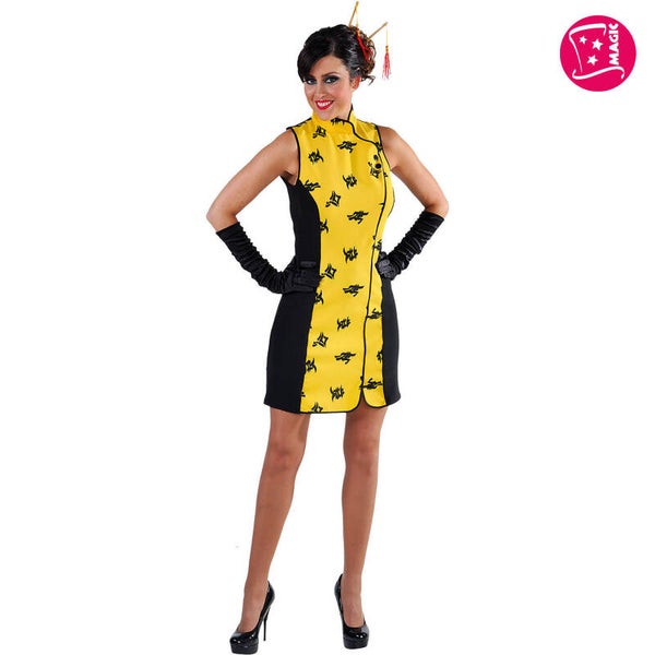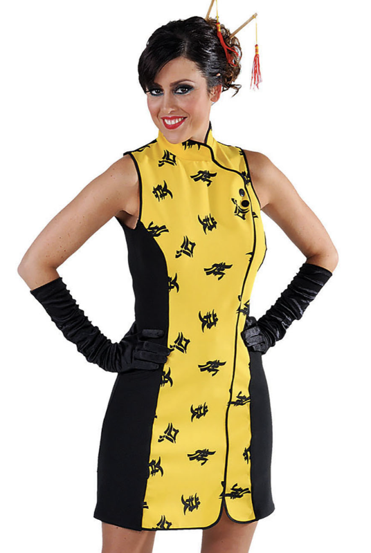 Chinees getailleerd mouwloos jurkje geel met zwarte Chinese tekens.