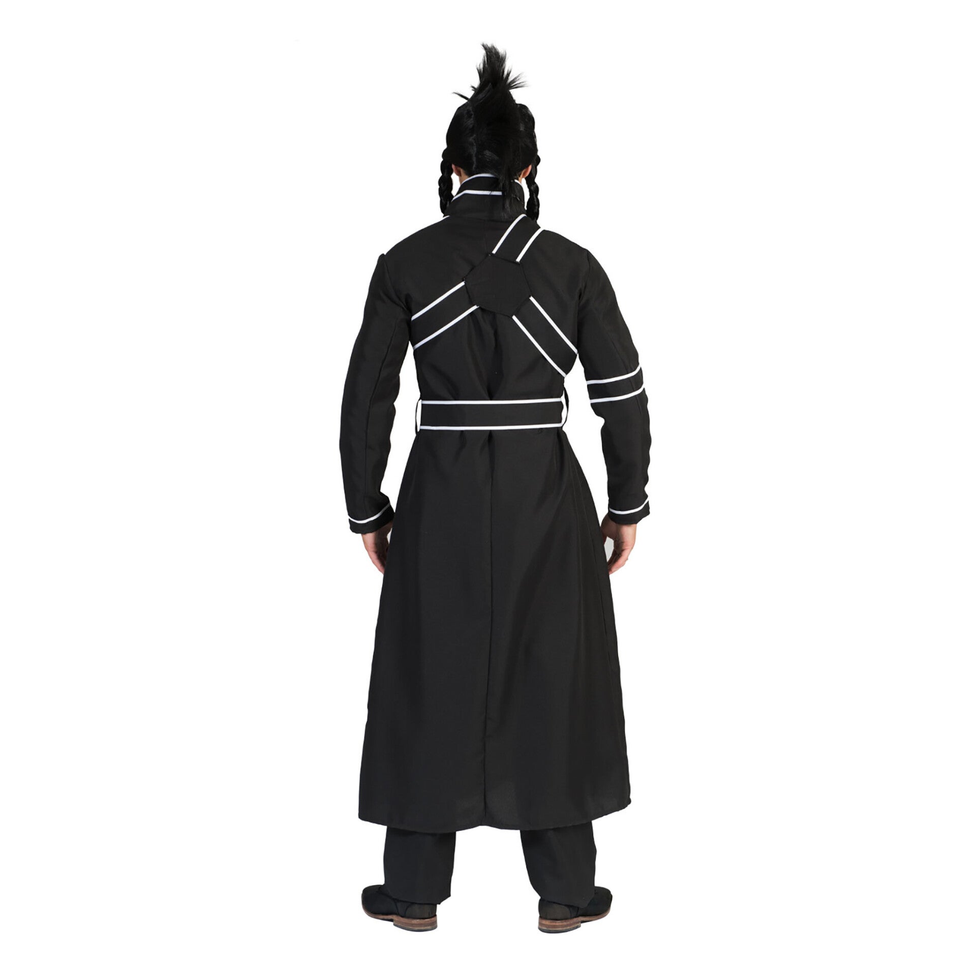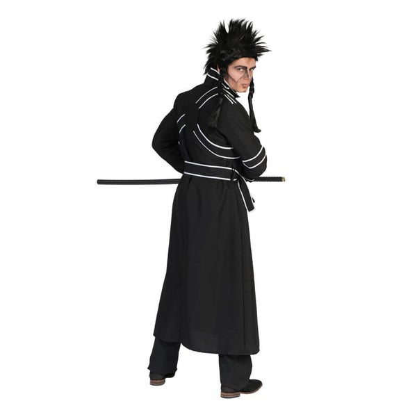Dit is een samuraikostuum voor heren, inclusief een lange zwarte jas met witte accenten en kruislinkse banden.