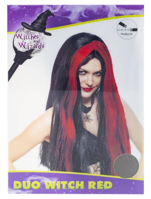 Pruik heks zwart met rode lok