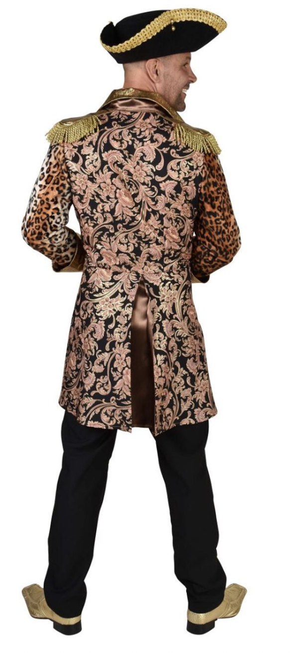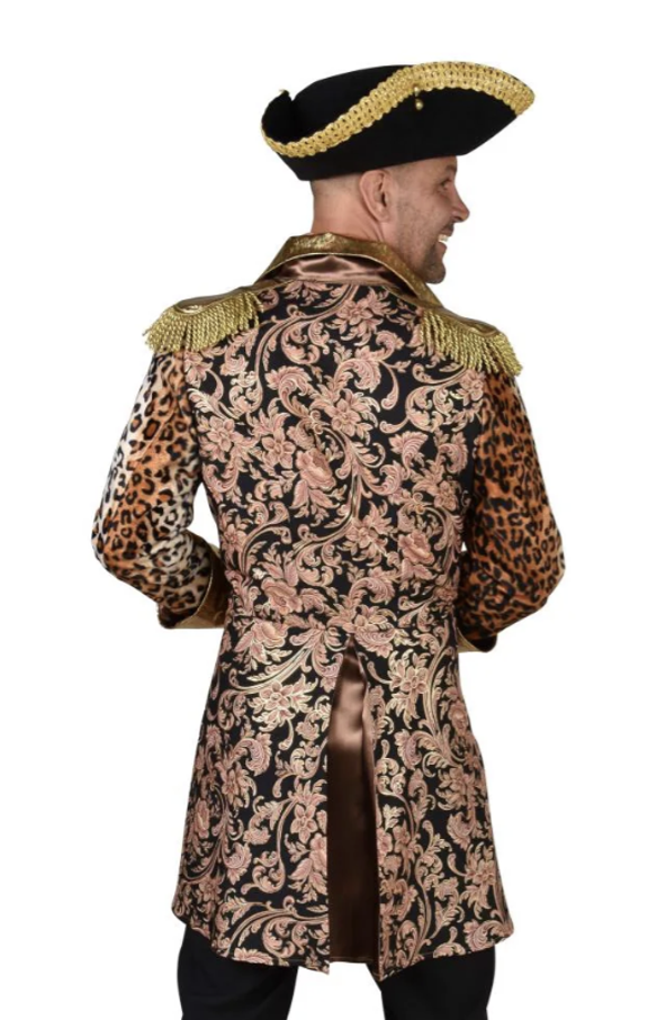 Prachtige herenjas met een zeer mooie pasvorm in een chique rosé goud/zwarte stof met mouwen van panterprint.