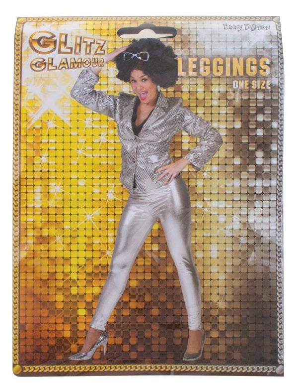 Schitter op de dansvloer met deze zilveren metallic disco legging! Perfect voor elk feest, one size fits most.