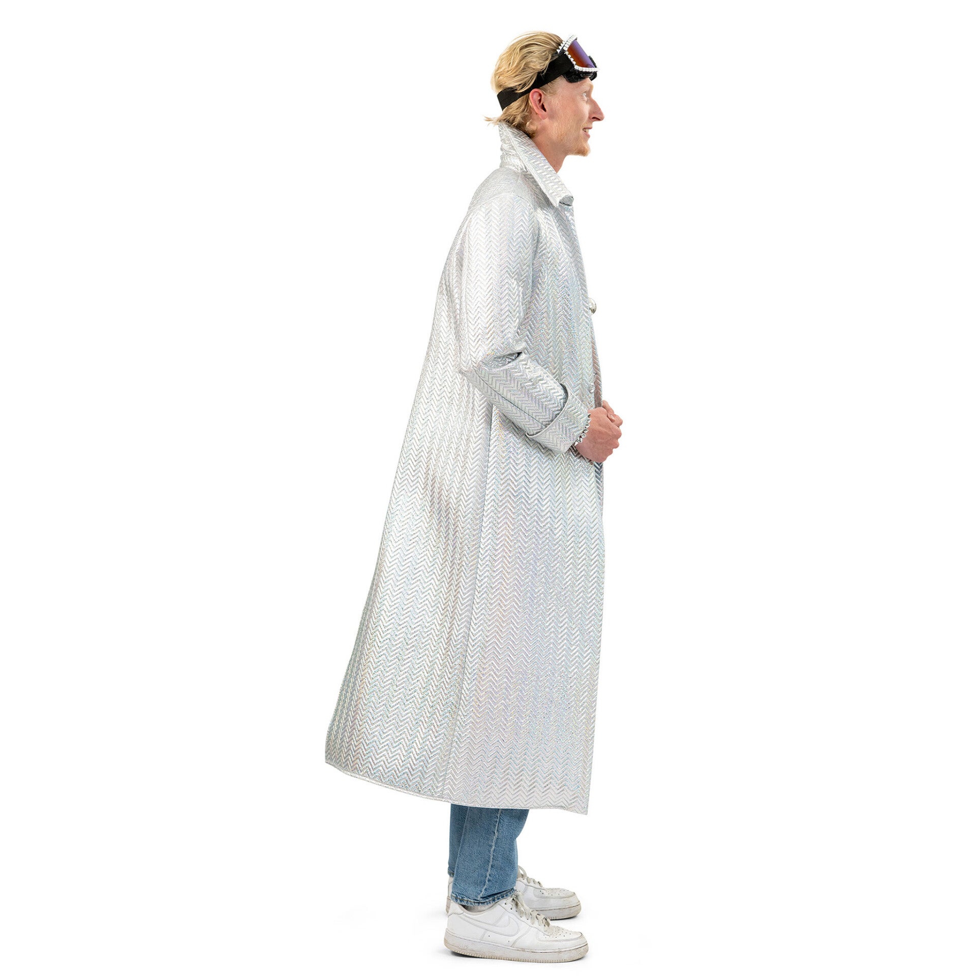 De lange, glanzende zilverkleurige jas heeft een futuristische metallic look die perfect past bij festivals, themafeesten en extravagante events zoals Burning Man of Carnaval.