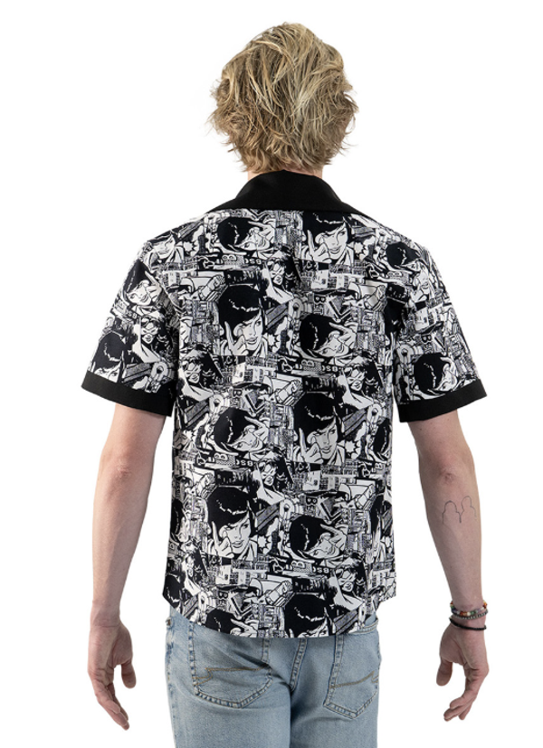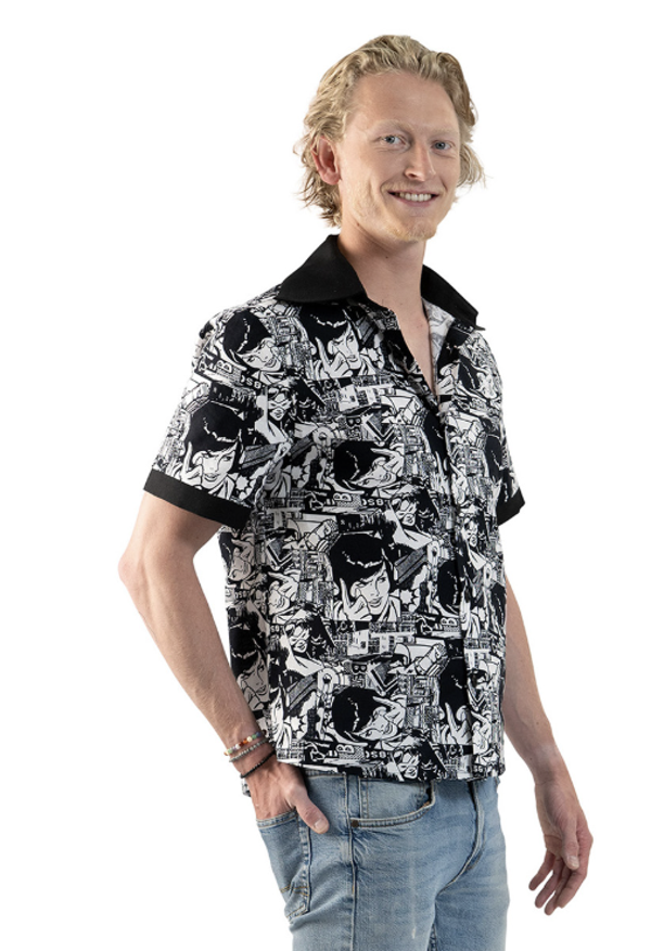 Mooie zwart/witte blouse met korte mouwen en een retro strip print. Een superleuke blouse voor een Rock & Roll of Jaren 50/60 feest! Combineer deze blouse met een mooie broek en accessoires en je bent klaar om te rocken!
