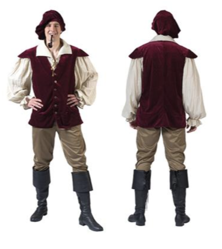 Dit is een Middeleeuws herbergier kostuum, bestaande uit een rood fluwelen hes, witte blouse met lange mouwen, groene pofbroek en zwarte laarzen.